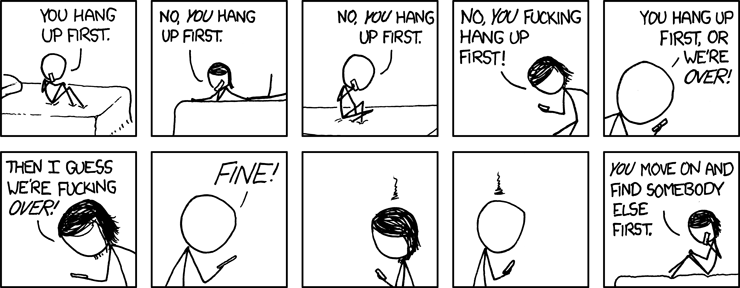 OK, so maybe you’ve never been either the mush-ball or the annoyed person in this situation, but I can tell you I most certainly been both, several times. But why does this happen? Why do we find it impossible to be the person who “hangs up first”? Why can’t we just let the other person miss us as much as we miss them? Why do we feel the need to continually up the ante? Is it some unwritten rule, like if you DON’T refuse for 10 minutes to be the one to hang up first that you don’t really care/love/cherish your SO? (more so in the beginning stages of a relationship, of course. By the time you’re at the one-year mark you’re most likely over this kind of BS and focusing on more realistic things, like showing you love each other by thoughtfully shooting your SO a text wishing them good luck on an upcoming meeting or reminding them of their dentist appointment later that day).